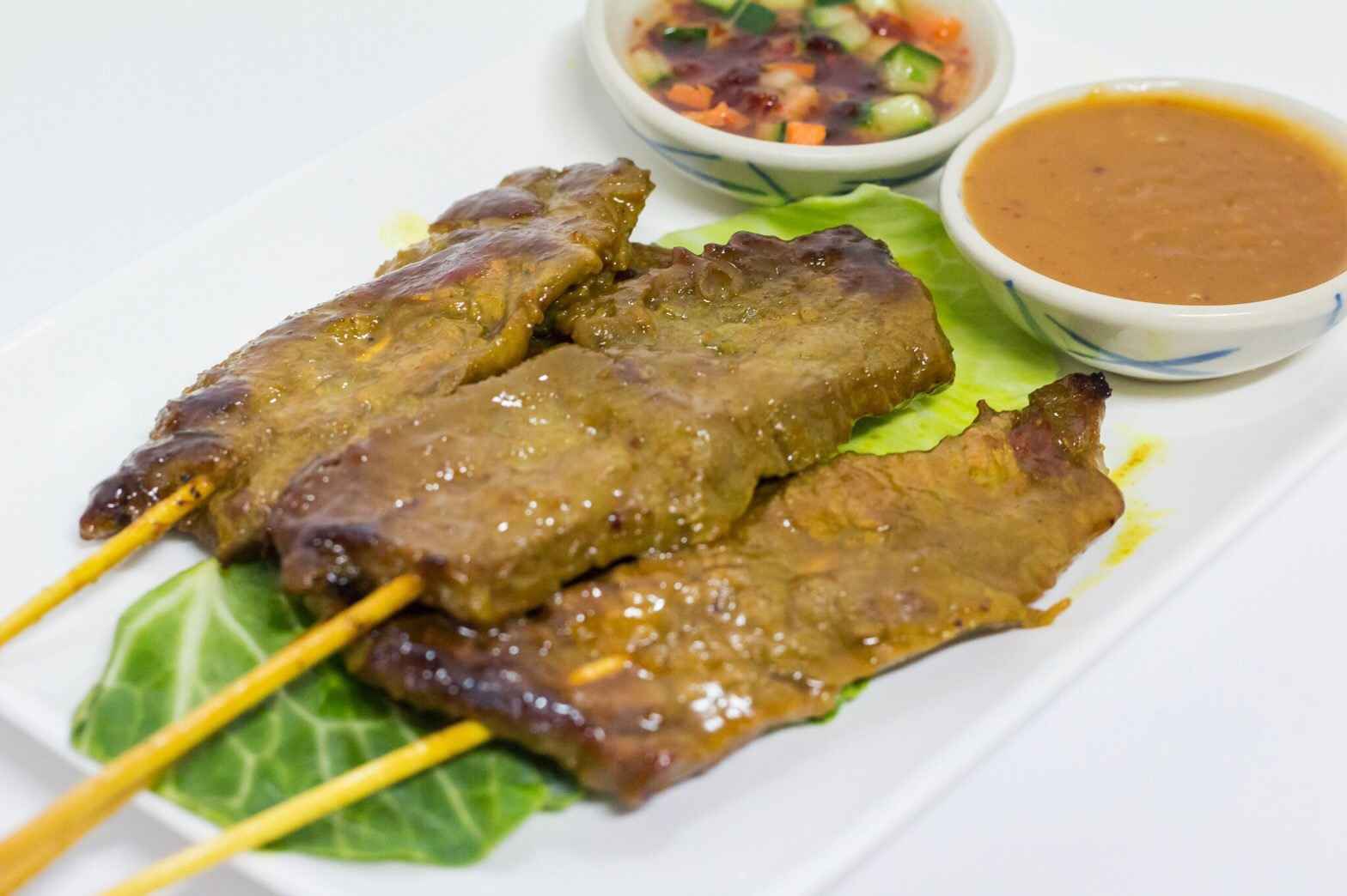 Beef Satay (4) $9.25Marinated meat on skewers grilled and splashed with coconut milk seasoned, served with peanut sauce and cucumber sauce